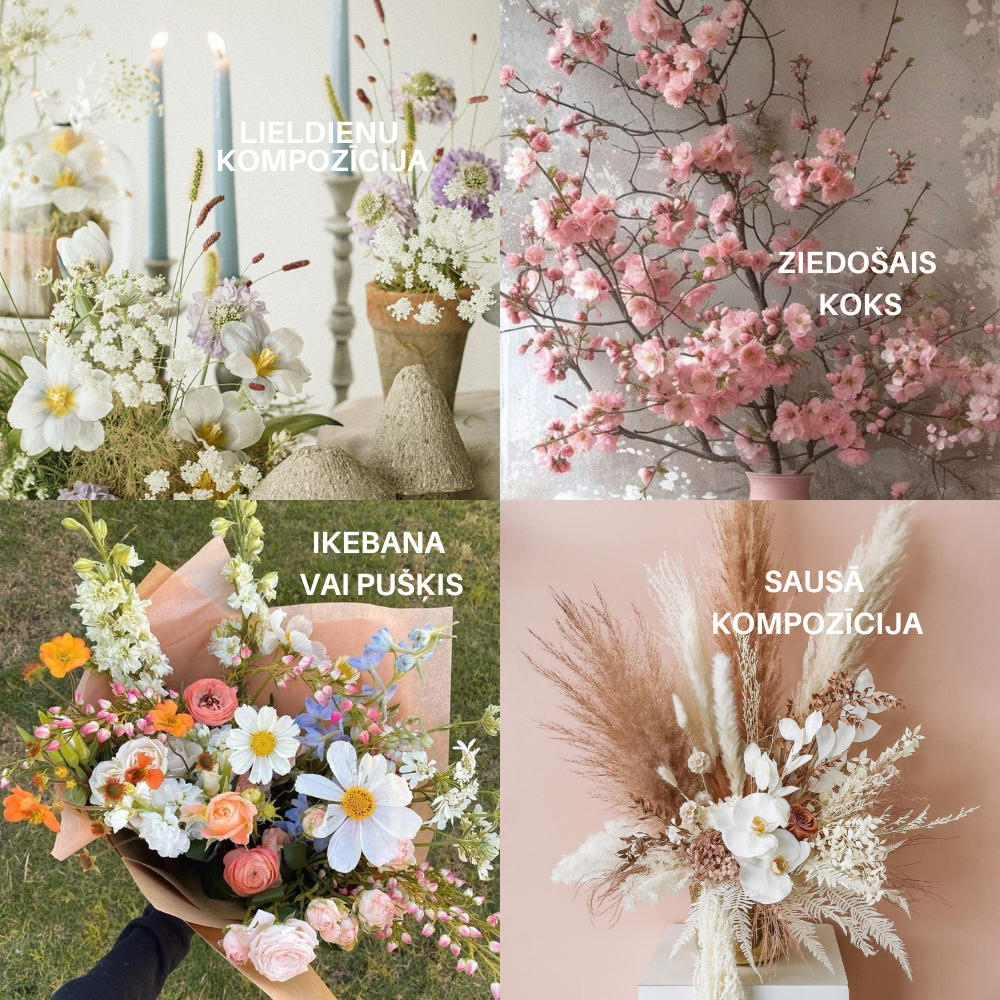 izmantojot skaistākos sezonālos ziedus un zaļumus, katrā no četrām nodarbībām veidosim dažādus pušķus, kompozīcijas, rīkosim stilizētas darbu skates, filmēsim, fotografēsim un baudīsim kopābūšanu.